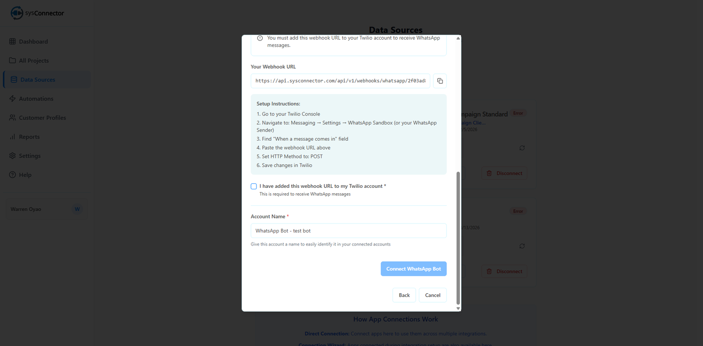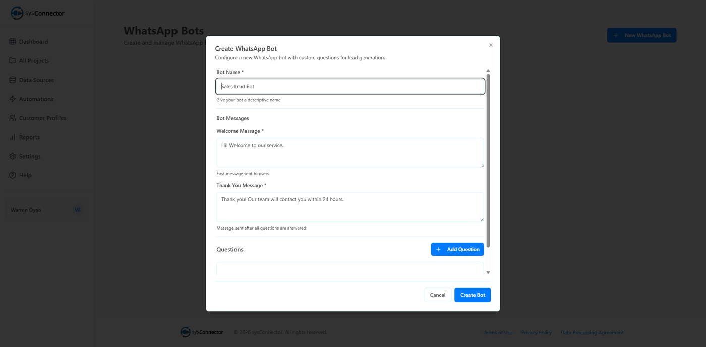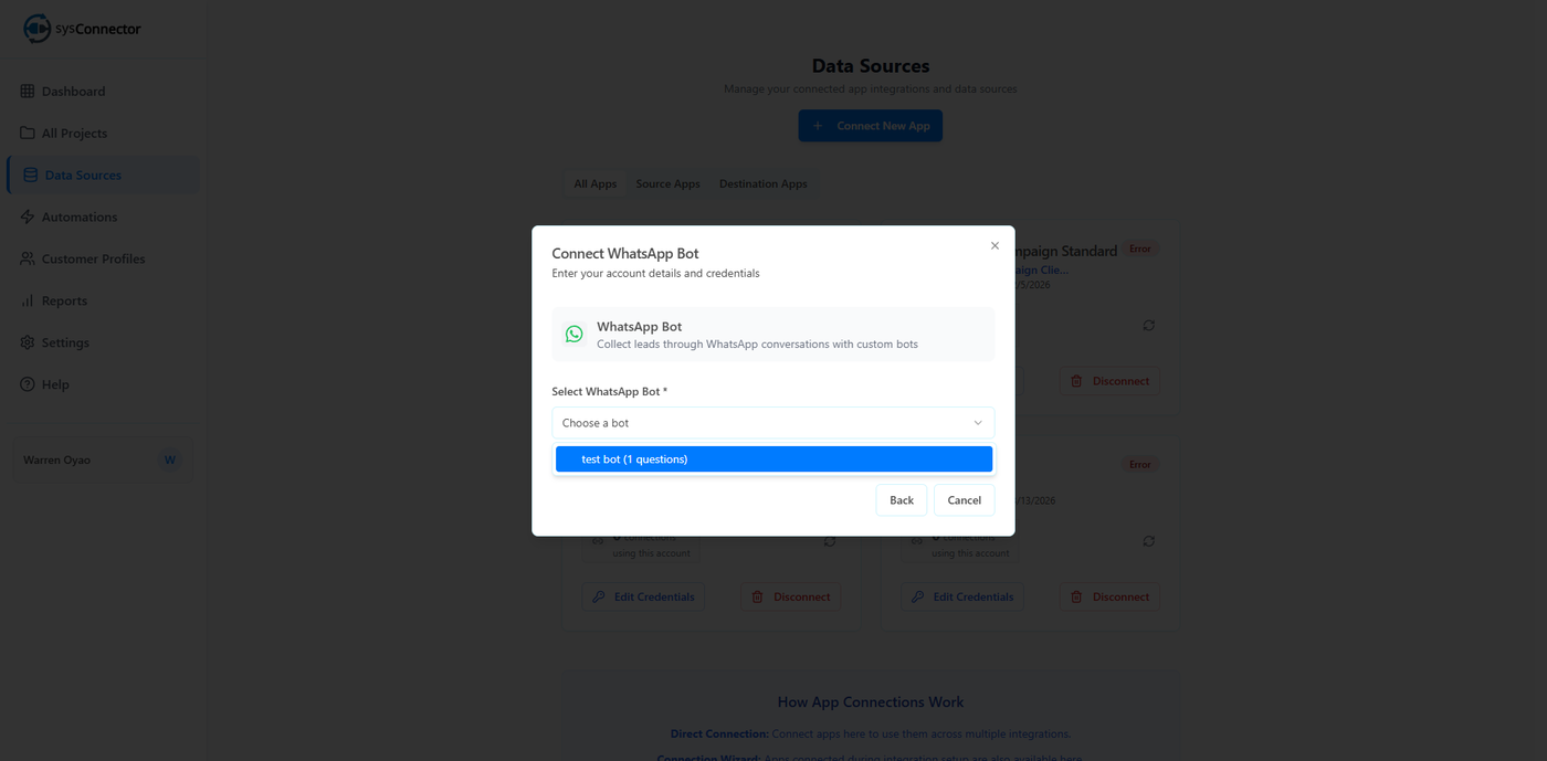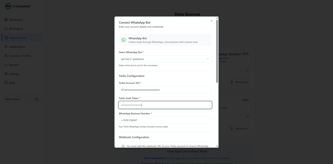 sysConnector is now connected to your WhatsApp Bot, and responses from users will begin syncing automatically.
