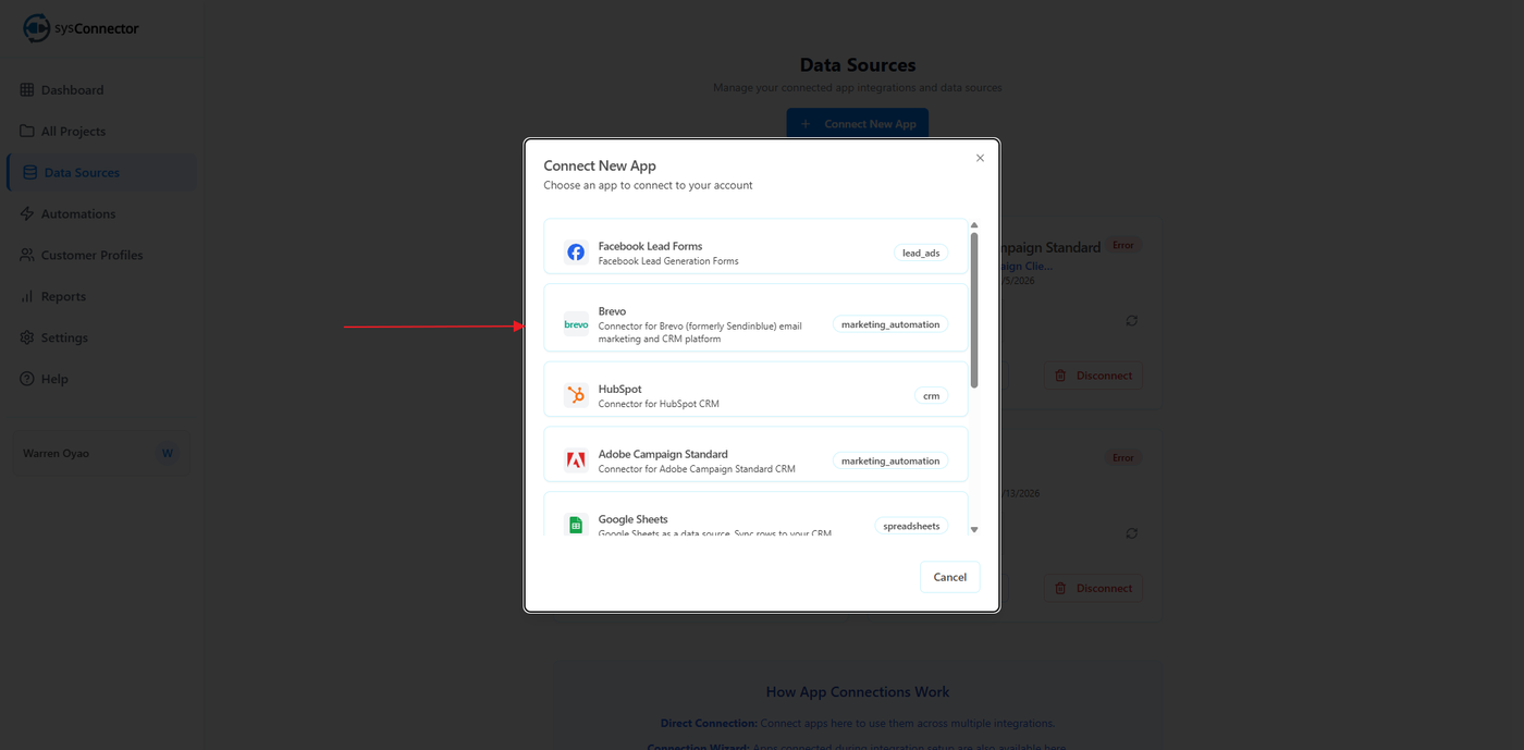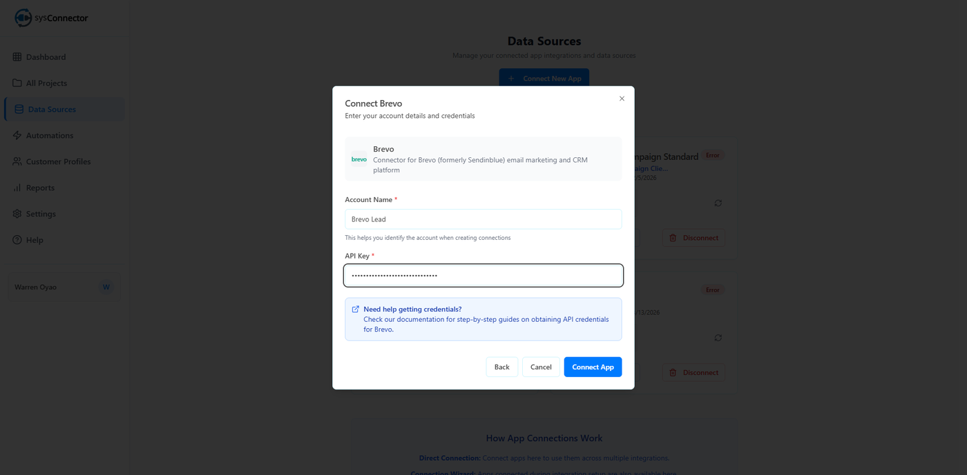 sysConnector is now connected to your Brevo account, and your data will begin syncing automatically.