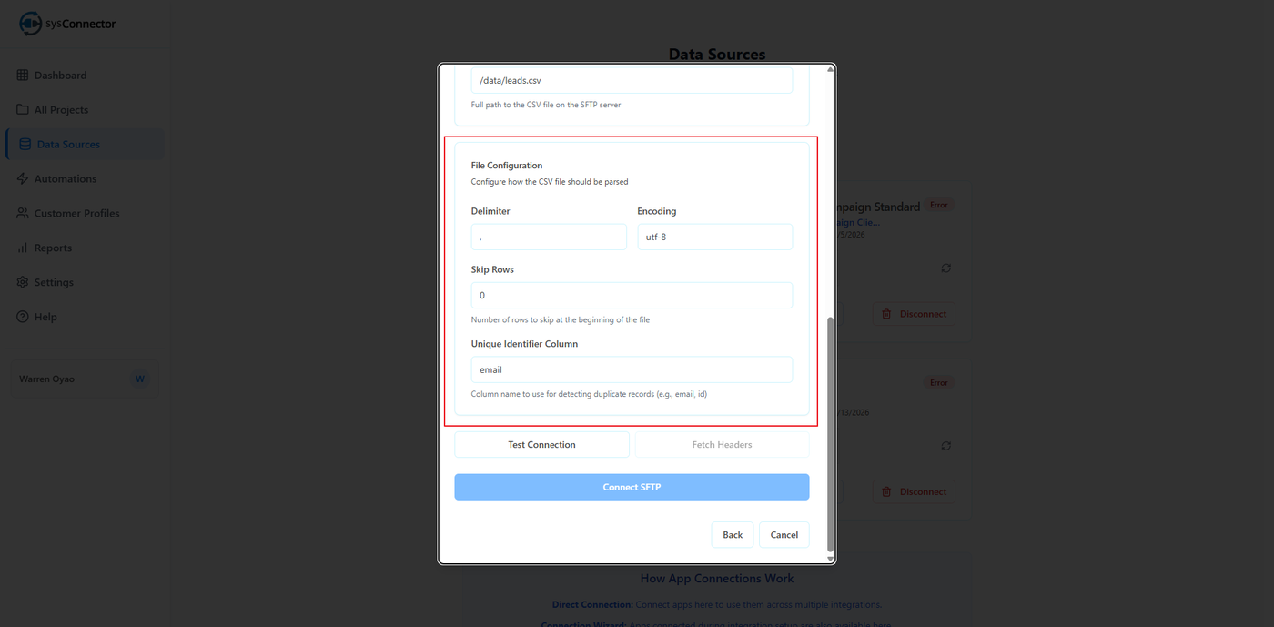 Connect SFTP – After confirming the headers, click this to complete the connection
