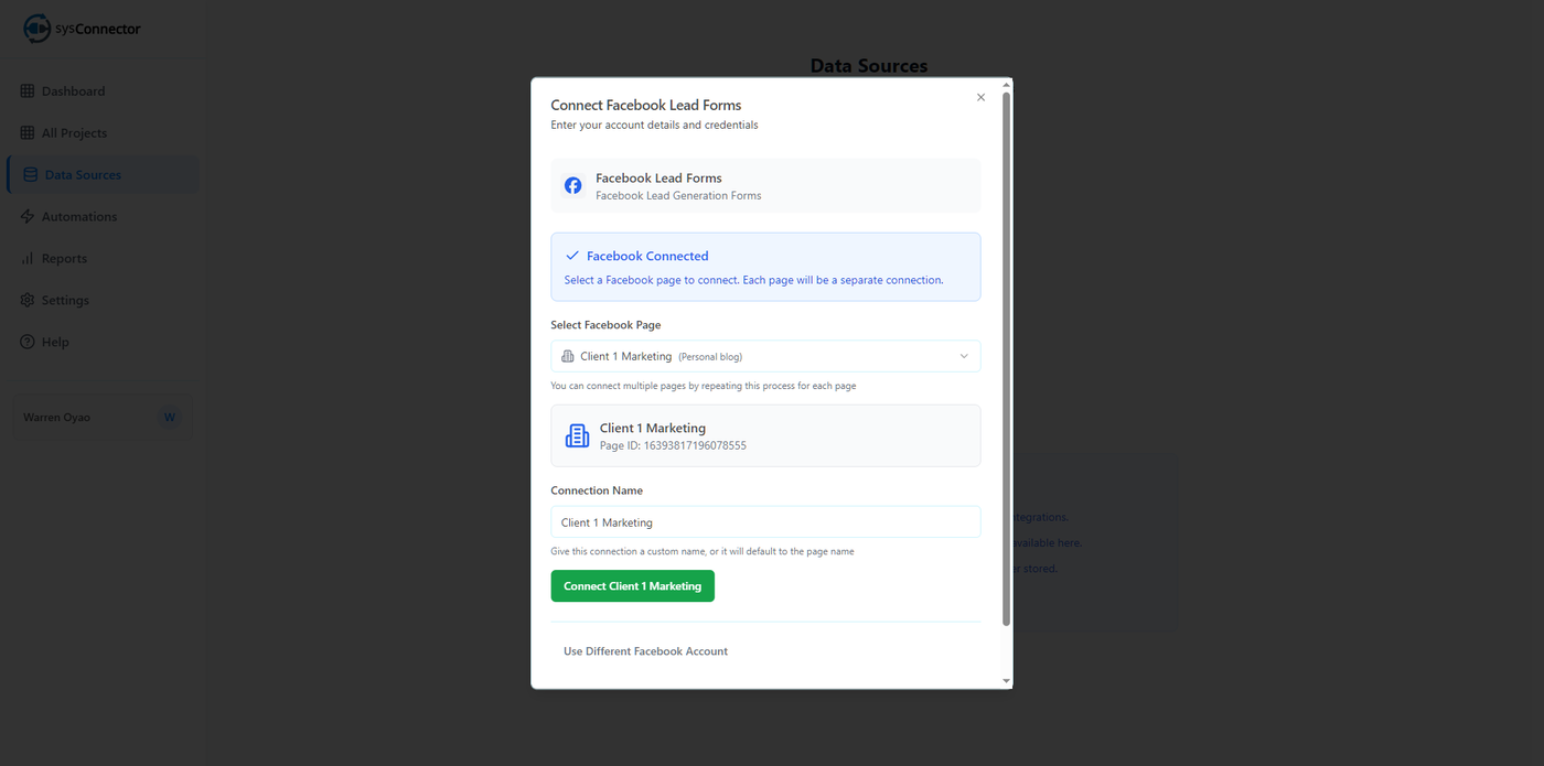 It is highly recommended to use the Facebook Page name (e.g., Client 1 Marketing) so the connection is easy to identify later.