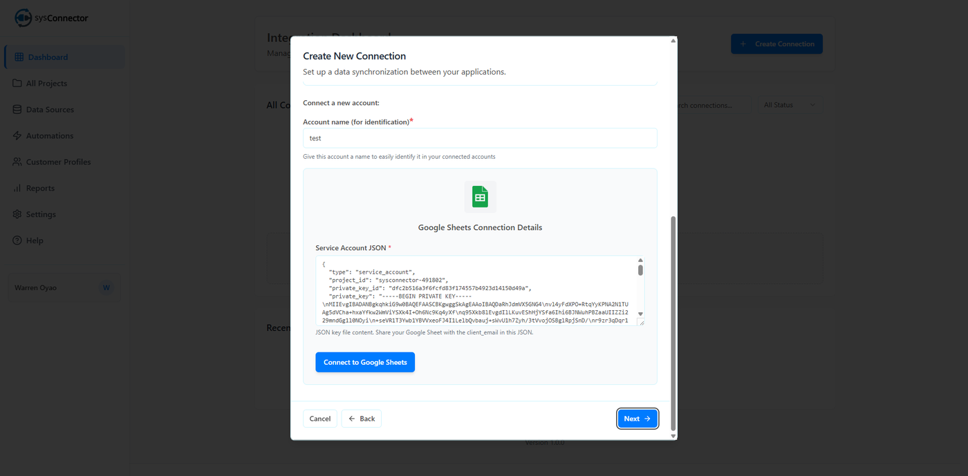 A JSON file will automatically download. This is your Service Account JSON. Keep this file secure and use it in sysConnector