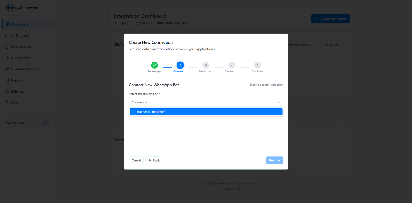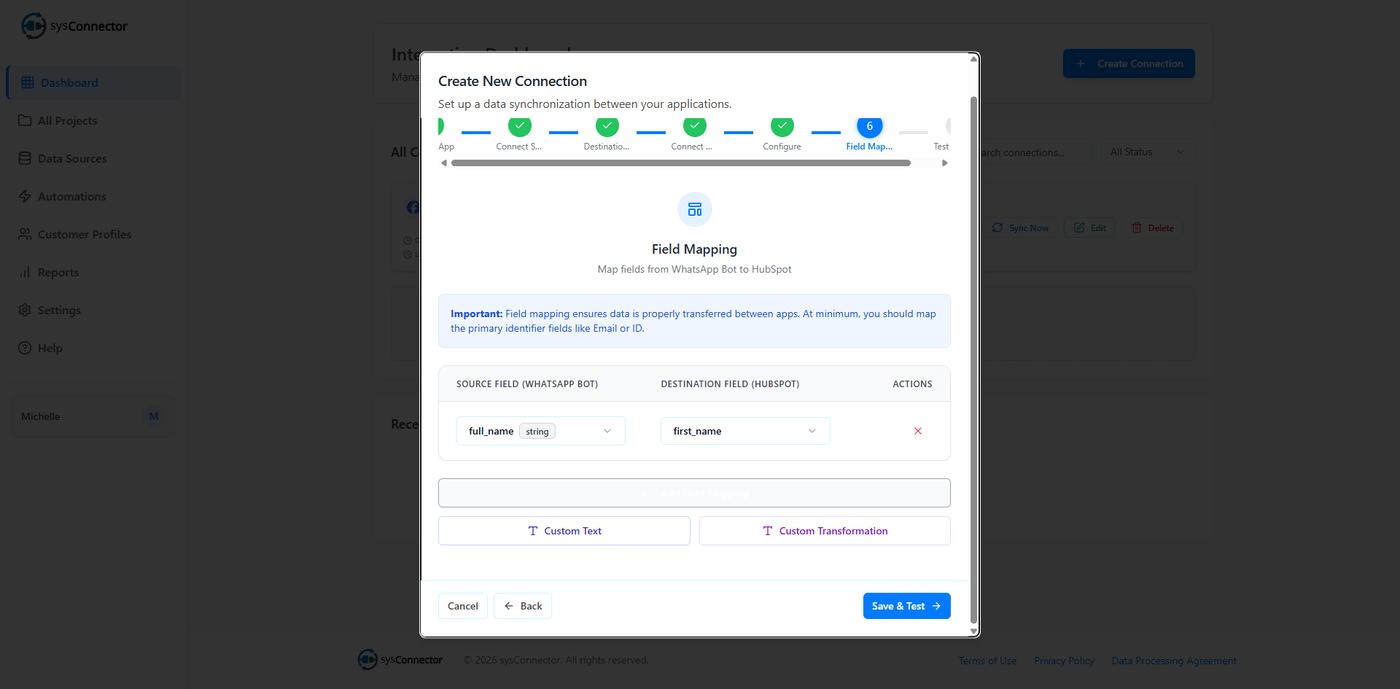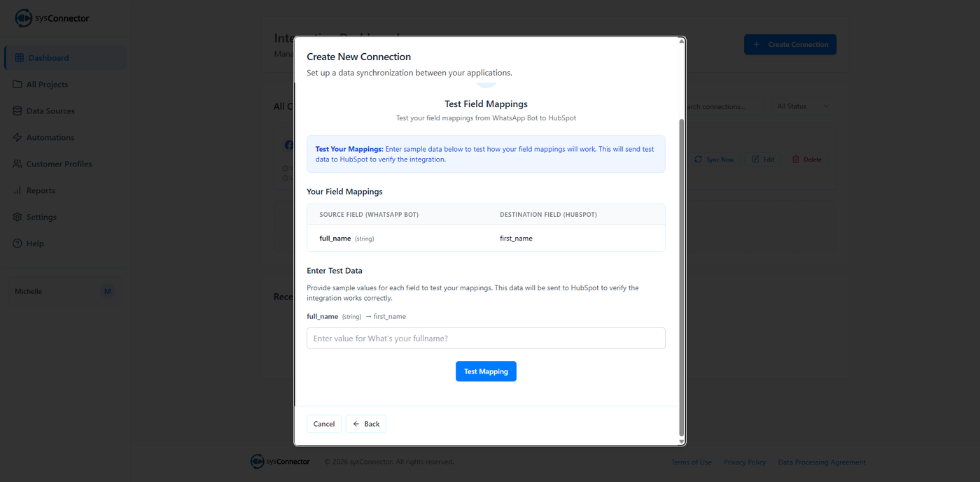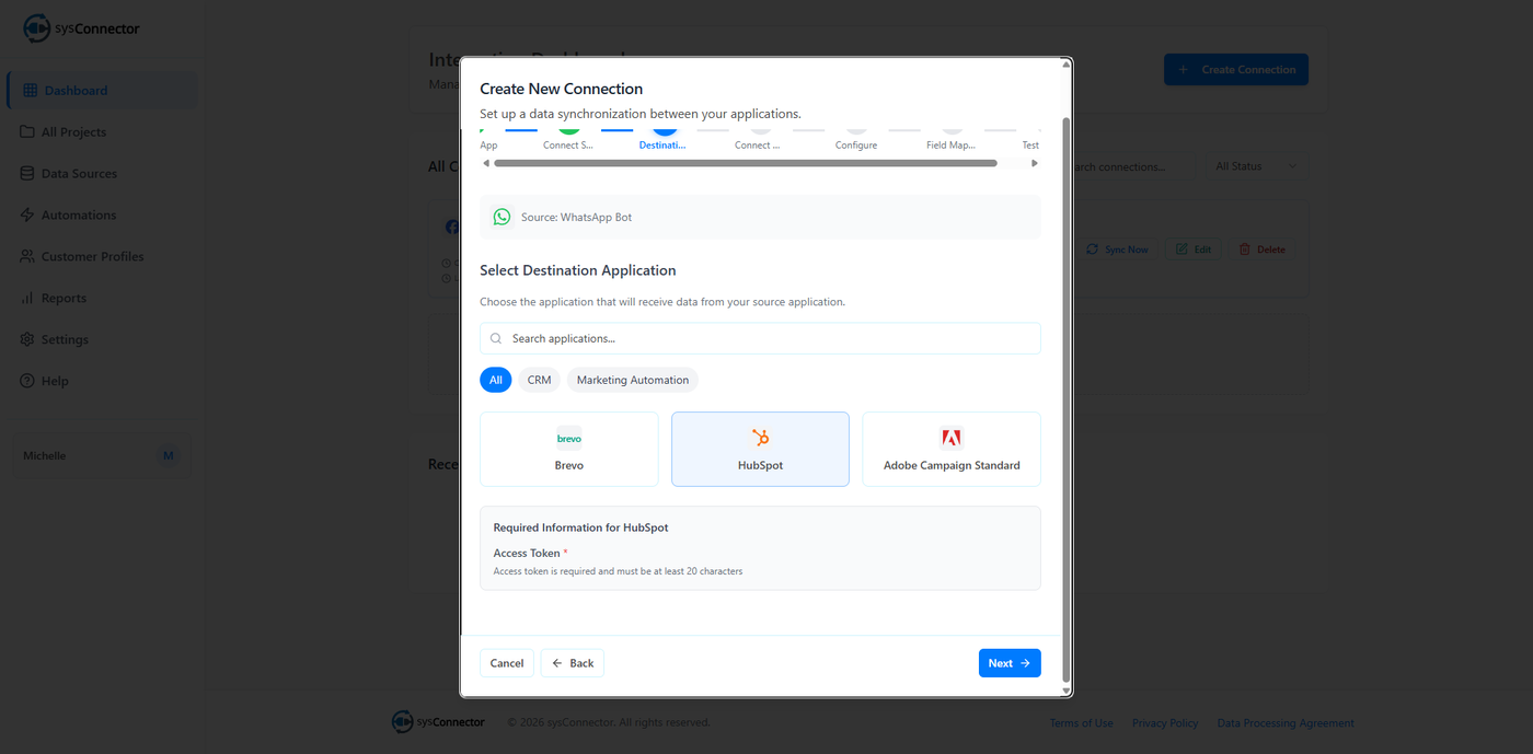 This guide walks you through the complete process of connecting a WhatsApp Bot (Source) to HubSpot (Destination) using the sysConnector platform. Once configured, user responses collected via WhatsApp will sync automatically into HubSpot.
