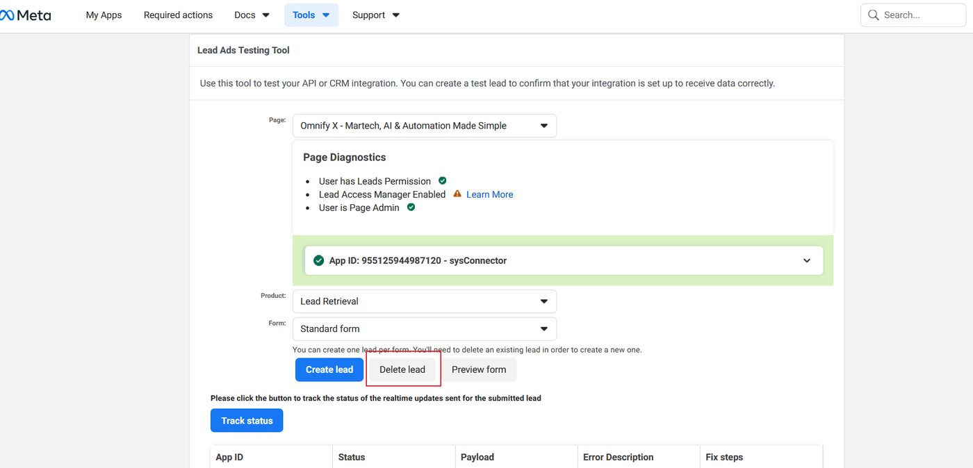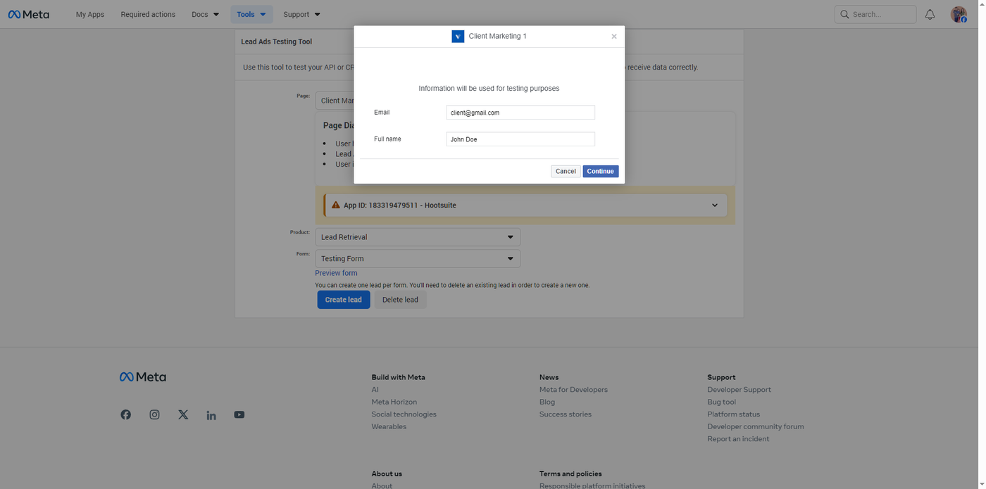 Open the Facebook Lead Ads Testing Tool in your browser.
